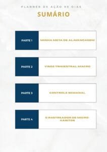 O seu roteiro de execução inegociável. Após identificar sua prioridade na planilha, este planner ajuda você a desdobrar sua grande meta em marcos de 30, 60 e 90 dias. Com campos para prioridades semanais e um rastreador de hábitos, ele é o companheiro ideal para garantir que você saia do planejamento e chegue ao resultado.